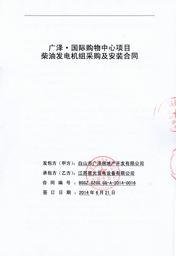 广泽国际购物中心项目柴油发动机组采购及安装合同