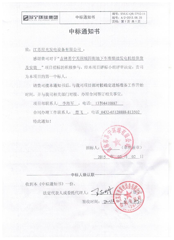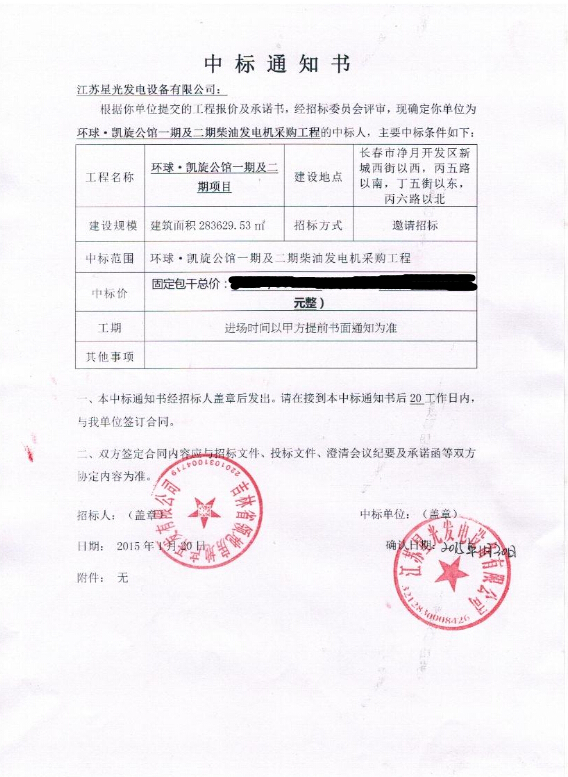 中国神华国际工程有限公司发电机组采购中标通知书