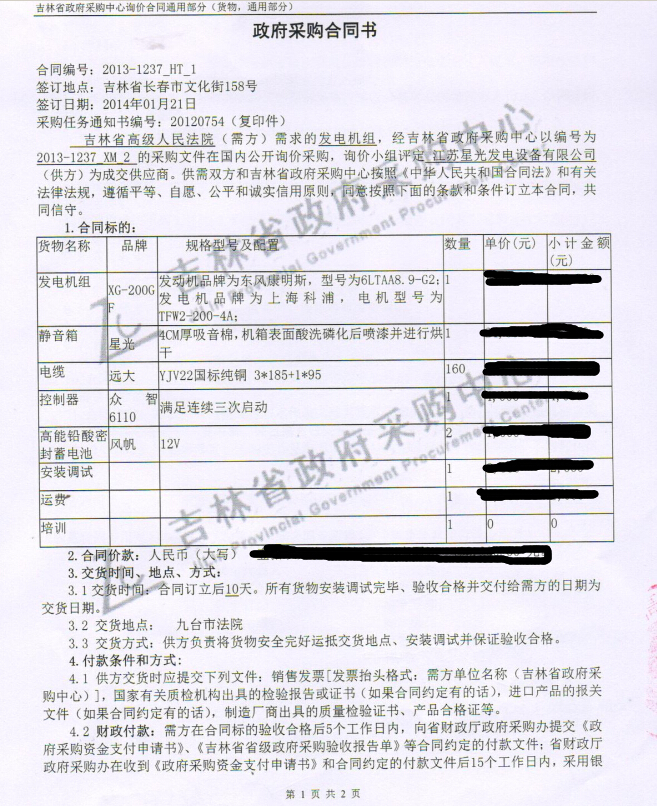 吉林省高级人民法院政府采购200KW发电机组: XG-200GF发电机组、星光静音箱、远大电缆、众智6110控制器、风帆高能铅酸密封蓄电池