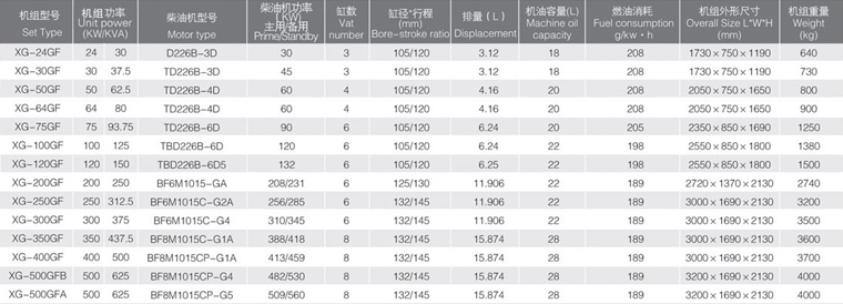 选用德国道依茨公司与潍柴、河柴、华柴技术合作生产的新型柴油发动机:产品结构紧凑、可靠性强、使用经济。排放达欧Ⅱ或欧Ⅲ标准;配备新型增压器,具有进气回流功能,能良好的适应高原、高海拔地区使用。